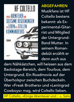 HF Coltello oder kurz Colt ist einer der besten Gitarristen Deutschlands. Bekannt geworden ist er vor allem als Mitglied der legendären Berliner Band Mutter. Mit »Einige Abenteuer und seltsame Begegnungen im Leben des stillen Kommandeurs« legt er einen Roman vor, und zu unserer sehr kleinen Verwunderung ist es ein Roman über Rock’n'Roll geworden.