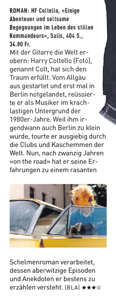 Heri Coltello, Gitarrist in verschiedenen Bands und auch solo, hat uns mit: »Einige Abenteuer und seltsame Begegnungen im Leben des stillen Kommandeurs“ einen furiosen Rockerroman vorgelegt. Und dieser Roman macht das, was ein Film, ein Roadmovie zumal, nicht können. Er schildert ohne Ende gewissermaßen den Ausschnitt, einer ewigen Bewegung, die diese Musik ist, die Coltello spielt. Eine Musik also, die die meisten von uns ein Stück des Lebens begleitet hat.